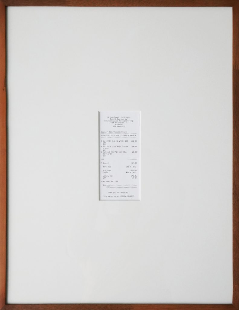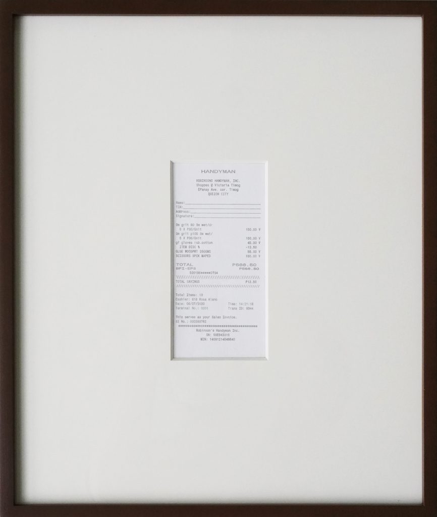 As in the case of my other printed matter drawings, the receipt drawings are an attempt at the impossible labour of rivalling technology. Carlomar Daoana, poet and colleague, described the process as painstaking, this letter-by-letter build-up that underscores the etymological root of art as “techne” or technique. By expending energy on easily discarded documents—this time, hardware store receipts—the object subjectified becomes an object beloved.